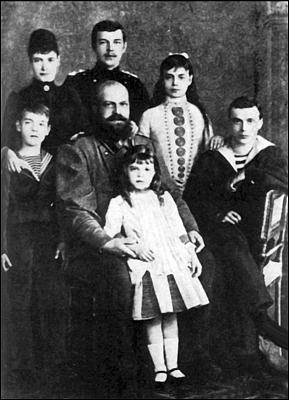 Императорская семья ок. 1906 г. Вокруг Александры и Николая слева направо: Анастасия, Алексей, Мария, Ольга и Татьяна.