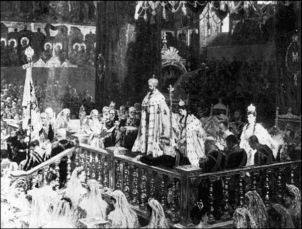 Коронование царя и царицы в Успенском соборе в Москве. Справа от императорской четы – императрица-мать.