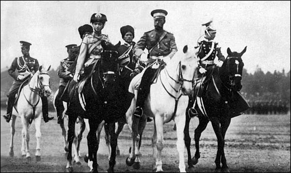 Петергоф, август 1913 года. Николай II с двумя старшими дочерьми на военном параде. Справа от государя – великая княжна Ольга в гусарском мундире; слева – вел. княжна Татьяна в мундире улана.