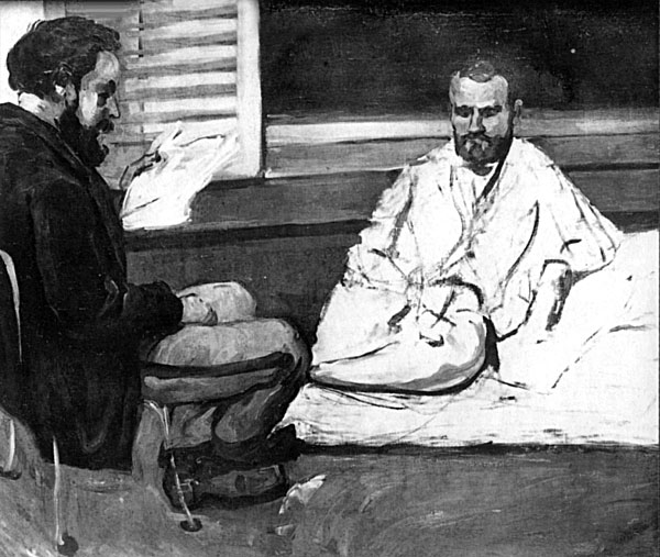 Труженик-одиночка Золя тем не менее испытывал потребность встречаться с друзьями. Он восхищался Флобером (1), который был для него ворчливым духовным отцом. Мопассан (2), который был десятью годами младше, привлекал его своими разнузданными нравами. От утонченного и скромного Эдмона де Гонкура исходило, несмотря на его манеры безупречного литературного аристократа, странное ощущение фальши. Что касается бледного и болезненного Альфонса Доде, он провинился, не оценив Мане.
