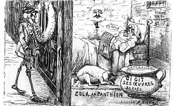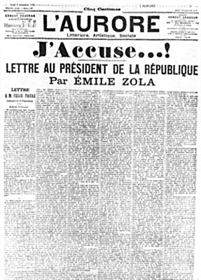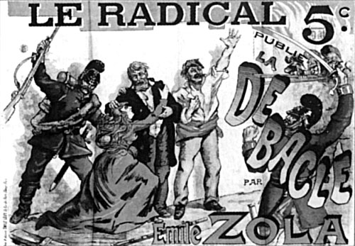 С «Делом» Золя вошел в политическую и нравственную историю своей страны: смело взявшись защищать капитана Дрейфуса (справа) в своей статье «Я обвиняю», он в результате был приговорен к году тюремного заключения и вынужден был бежать в Англию. Сделавшись мишенью реакционной прессы, он будет сражаться до тех пор, пока не восторжествуют правосудие и истина. Именно этого упорства не простят ему противники: даже его смерть и его погребение в Пантеоне дадут карикатуристам дополнительный повод для того, чтобы его высмеять.