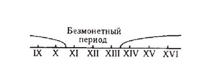 Загадочный провал – трехсотлетний перерыв – в монетной истории Руси неоднократно обсуждался в литературе. Пишут так. «Дискуссия о методах датировки клада у нас острее, чем в других европейских странах, ибо НИГДЕ НЕ БЫЛО СТОЛЬ ДЛИТЕЛЬНОГО "БЕЗМОНЕТНОГО" ПЕРИОД А (ВРЕМЕНИ, КОГДА В ОБРАЩЕНИИ ЧЕКАНЕННАЯ МОНЕТА, МОЖНО СКАЗАТЬ, ПОЛНОСТЬЮ ОТСУТСТВОВАЛА), ЧЕМ НА ТЕРРИТОРИИ ДРЕВНЕЙ РУСИ. Этот период начался на севере Руси практически с 30 – 40-х годов XII века, а в южнорусских областях – ЗНАЧИТЕЛЬНО РАНЬШЕ. Заканчивается "безмонетный" период с возобновлением собственной русской чеканки – во второй половине XIV века» [684], с. 182.