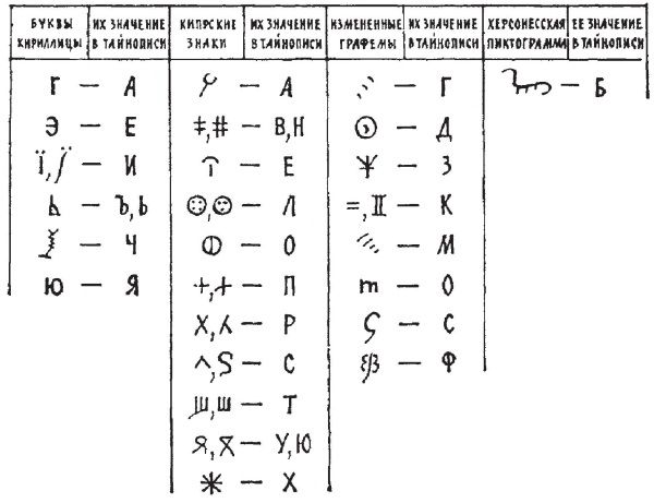 Мы не занимались сами этой проблемой. Все же выскажем одно наблюдение, которое, возможно, окажется полезным в будущем. Так называемая «тайнопись», то есть письмо с использованием непривычных сегодня букв, было, по-видимому, довольно распространенным явлением вплоть до XVII века. В том числе и на Руси. Известны примеры бесспорного прочтения некоторых таких надписей. К ним относится надпись на русской книге XVII века, расшифрованная Н. Константиновым [425]. Мы уже рассказывали о ней в книге «Тайна русской истории», гл. 1:6. Эта русская надпись, кстати, тоже много лет считалась историками совершенно не поддающейся расшифровке. Мы еще раз приводим здесь на рис. 3.2 саму надпись, а на рис. 3.3 – таблицу расшифровки ее символов, предложенную Н. Константиновым [425].