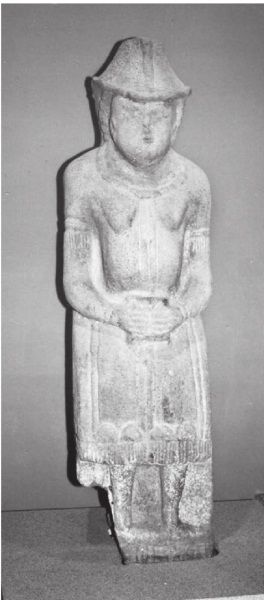 Рис. 3.31. Каменное скифское изваяние, выставленное в Государственном Историческом Музее города Москвы. Статуя – женская. Прижимает к животу предмет, называемый сегодня чашей. На голове – шляпа. Похоже, что волосы заплетены в косы