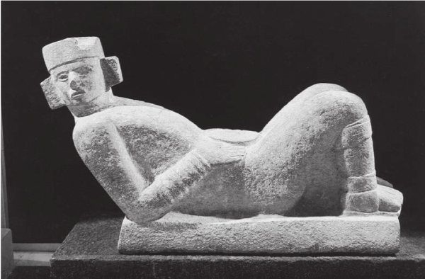 Рис. 3.34. Каменная статуя бога Chac Moolу входа в «Храм Воинов» в Чинен-Ице. Человеческая фигура, прижимающая к пупку чашу. Изображение бога Майя и Толътеков. Главный мотив – тот же, что и у скифских изваяний: чаша, прижатая к животу. Взято из [1056], с. 34