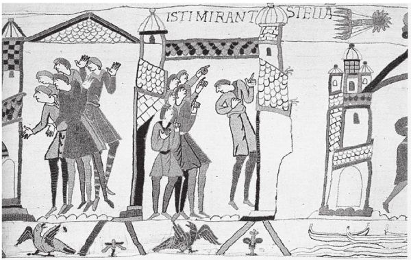 Сегодня считается, что китайцы наблюдали все ее появления по крайней мере от I века до н. э. вплоть до современности. Считается, что современная теория движения кометы Галлея подтверждается древними китайскими записями и, в свою очередь, эта теория подтверждает скалигеровскую хронологию Китая. На рис. 5.6 мы приводим изображение кометы на старинном ковре Байе. Скалигеровская история уверяет нас, будто здесь показана комета Галлея, появившаяся якобы в 1066 году.