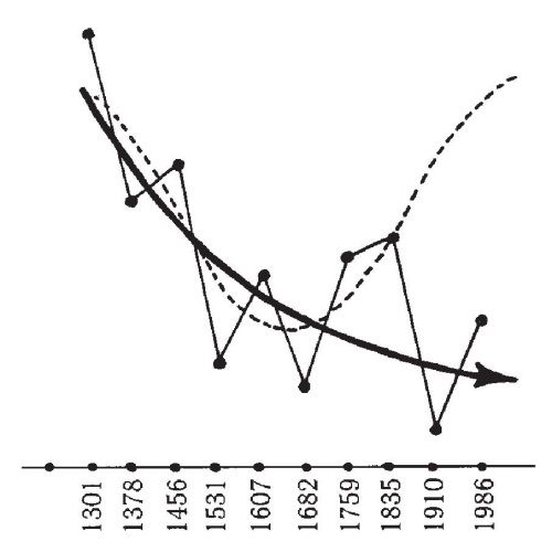 Рис. 5.11. Реальное поведение кометы Галлея за последние шестьсот лет. Это – жирная кривая. Пунктиром показано – как комета Галлея должна была бы себя вести в соответствии с фальшивым периодическим законом «древне»-китайских записей. Как и на предыдущих графиках, по горизонтали отложены даты появления кометы Галлея.