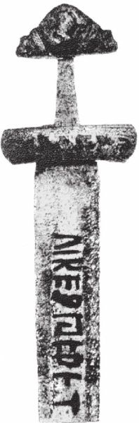 Здесь в круглых скобках – буквы, добавленные Дброглавом. Мы уже высказали свое скептическое мнение об этом «методе прочтения» непонятных надписей на мечах, предложенном историками. Нам кажется, что задача прочтения непонятных надписей на мечах и на монетах – чрезвычайно интересная и, возможно, сложная задача, которая должна быть строго поставлена и решена. По сути дела, это – известная задача дешифровки. Такие задачи успешно решают специалисты в этой области, в том числе и математическими методами.