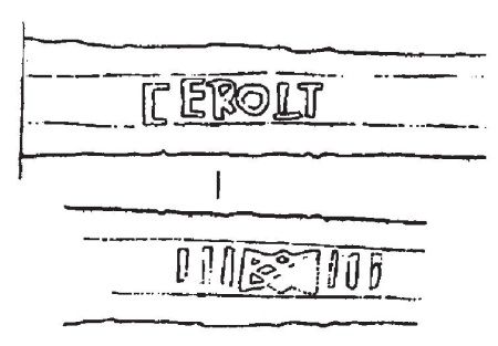 НАДПИСЬ 4. Она показана на рис. 3.7. АН. Кирпичников предлагает читать по-латински и получает LEITPRIT. Такого латинского слова нет [237]. Применяя таблицу Н. Константинова, получаем ЦЕСТАРИЕ или ЦЕСТАНИЕ. Похоже на старое русское слово ЦЕСТИТЬ, то есть ЧИСТИТЬ. См. Словарь М. Фасмера [866]. Получается, что на мече написано: ЧИСТОЕ, то есть, возможно, ЧИСТАЯ сталь или ЧИСТОЕ оружие, или что-то еще в таком роде. А на обратной стороне клинка – символ, означающий, по таблице Н. Константинова, букву Б.