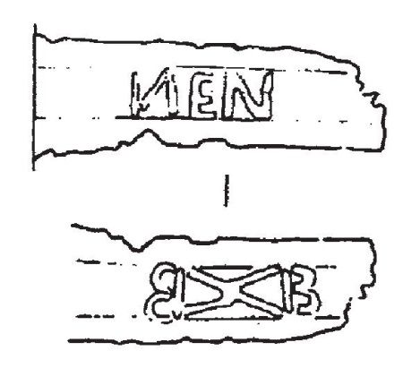 НАДПИСЬ 3. См. рис. 3.6. АН. Кирпичников снова предлагает прочитывать ее по-латински. Предлагается чтение ULEN. Такого латинского слова нет [237]. Если же это – имя, то скорее всего славянское – УЛЬЯН. Но если читать по таблице Н. Константинова, то получается ИСОН или ЯСОН, или ЯСНЫЙ. Тоже подходит для меча.