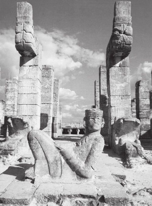 Рис. 3.34. Каменная статуя бога Chac Moolу входа в «Храм Воинов» в Чинен-Ице. Человеческая фигура, прижимающая к пупку чашу. Изображение бога Майя и Толътеков. Главный мотив – тот же, что и у скифских изваяний: чаша, прижатая к животу. Взято из [1056], с. 34
