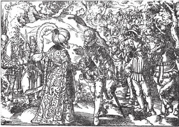 Рис. 3.35. Встреча посла русским государем. На голове русского царя чалма или тюрбан с пером. Гравюра из книги Sigmund Freiherr zu Herberstein. «Die Moscovitische Chronika…» – Francfurt am Mayn: Zigmund Feyerabend, 1576. Взято из [161]