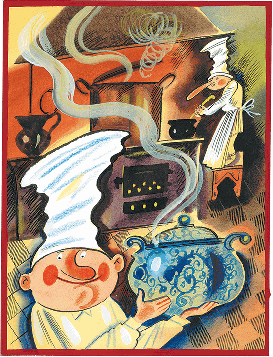 Подготовив кушанья к варке, карлик велел поставить обе кастрюли на огонь и не снимать их, пока он не прикажет. Потом он начал считать: «Раз, два, три, четыре…» – и, досчитав ровно до пятисот, крикнул: «Довольно!» Поварята сдвинули кастрюли с огня, и карлик предложил начальнику кухни отведать его стряпни.