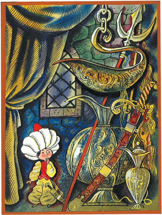 И вдруг туфли подняли его на воздух и быстро, как ветер, побежали по облакам. Не успел Маленький Мук опомниться, как очутился в городе, на базаре.