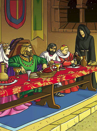 Господар оселі лукавив – його кухар вважався найкращим в окрузі. Пряна свинина, зайчатина, оленячий окіст, дичина на рожні, риба, свіжоспечений хліб, пироги та медівнички подавалися до столу в надзвичайній кількості. Срібні кубки жодної миті не стояли порожніми – і невдовзі стало зрозуміло, що такий бенкет не потребує застережень. Седрик Сакс першим повернув голову до бічної двері, звідки пролунав вигук дворецького: