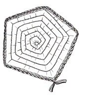 Вязание мотива, имеющего форму пятиугольника (рис. 33), аналогично выполнению квадратного мотива. При этом, прокладывая очередной ряд, увеличьте количество петель на 2. Полученное из начальной цепочки кольцо-основу условно разделите на 5 равных частей-сторон, после чего последовательно обвяжите каждую грань.
