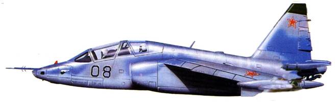 Су-25 с бортовым номером «25» красного цвета. 357-й отдельный штурмовой авиационный полк 16-й воздушной армии. Восточная Германия, начало 90-х годов. На внешней подвеске — УР воздух-поверхность Х-29МЛ с палуактивным лазерным наведением. На внешний пилон подвешена УР воздух-воздух Р-60 ближнего радиуса действия.
