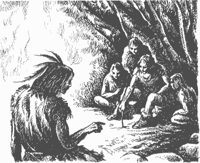 Здесь они узнавали о подвигах лучших охотников племени, о жизни богов, об охотничьих хитростях. Здесь они знакомились с жизнью и обычаями чужих племен, узнавали, как пройти в далекие земли.