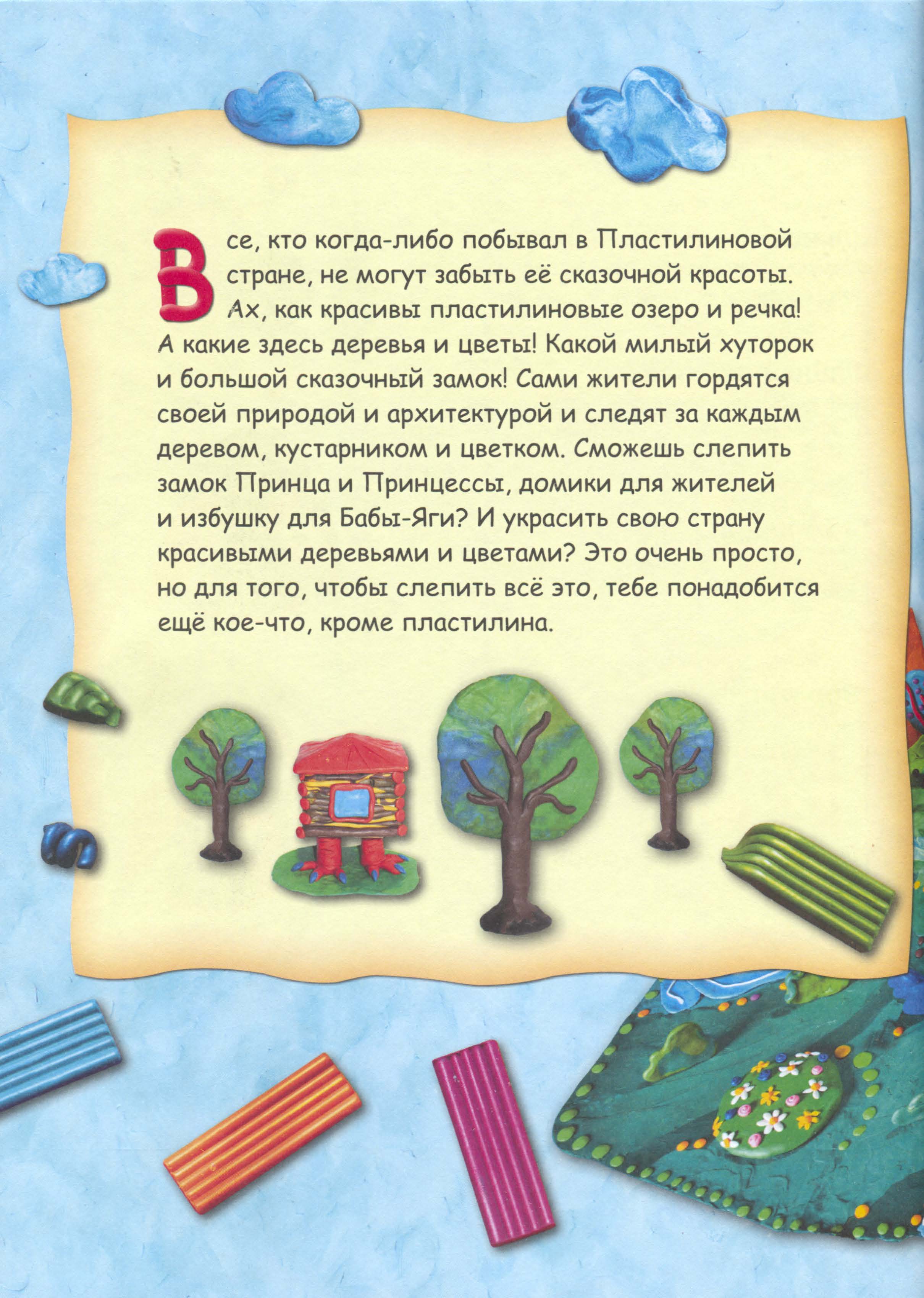 Книга наглядно и в доступной для детей форме демонстрирует весь процесс лепки, последовательно и по шагам разъясняя технику работы с пластилином. В книге также помещены мастер-классы по лепке. Издание поможет развитию моторики рук ребёнка и будет полезна в любом возрасте. С помощью этой книги ваш ребёнок сможет создать свою собственную страну. Чётко следуя предложенным урокам или импровизируя, малыш силой своей фантазии способен оживить обыкновенный кусочек пластилина. Во что он превратится - в сказочный замок, в дракона, или, быть может, в обаятельную Бабу-Ягy - решать вашему ребёнку.