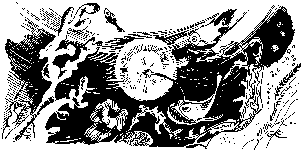 Иногда в океане можно плыть долго-долго, не встречая ничего достойного внимания. Где-то высоко над головой метеором пронесётся огонёк, где-то в стороне зажгутся длинные сверкающие полосы, отмечая путь причудливых рыб, и кто-то большой и неповоротливый шумно вздохнёт, опускаясь в глубины. Вот и сейчас мимо Долопихтиса стремительно пронеслись саблезубые рыбы-гадюки, крохотные хищники с необычайно свирепой наружностью и столь же определённо выраженным характером. Долопихтис с сожалением посмотрел им вслед: рыбы-гадюки были проворны и плавали быстрее удильщика. Но на всякий случай он поплыл за ними следом. Неожиданно он увидел плывущую медузу. Бледный и призрачный контур делал её во тьме почти незаметной, и поэтому Долопихтис не удивился, столкнувшись с медузой нос к носу.