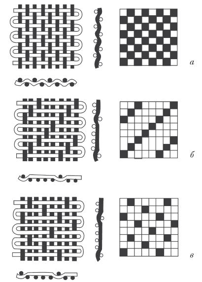 Рисунок 1. Основные виды полотен по переплетению нитей: а) полотняное; б) саржевое; в) атласное (сатиновое)