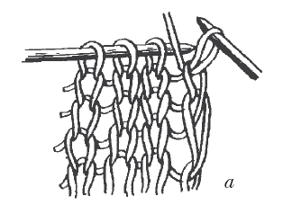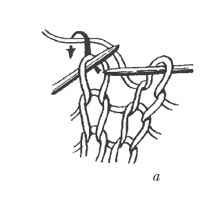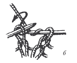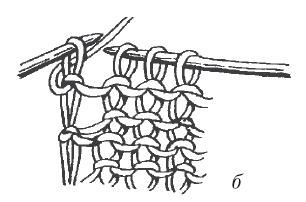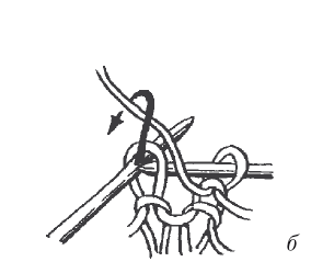«Бабушкина» изнаночная петля вывязывается следующим образом: рабочую нить располагают перед левой спицей, сняв кромочную петлю; правую спицу вводят в петлю справа налево за нитью; нить захватывают и проводят через петлю, образуя новую петлю на правой спице (рис. 20, а, б).