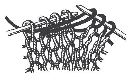 Обхватывающие петли с накидом выполняют в следующей последовательности: провязывают 1 изнаночную петлю, накид, 2 лицевые петли; затем левую спицу вводят под накид впереди работы и надевают его на 2 провязанные лицевые петли; в четных рядах вывязывают 1 петлю лицевой, 2 изнаночные и т. д.