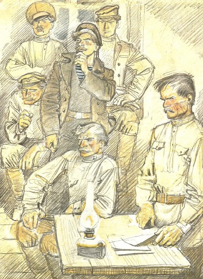 Пришлось Мишке сидеть дома. Уже смеркалось, когда дед и отец собрались и пошли в исполком на собрание. Мишка натянул дедов картуз и пошел следом. Исполком помещается в церковной сторожке. По кривым, грязным ступенькам влез, кряхтя, Мишка на крыльцо и прошел в комнату. Под потолком ползает табачный дым, народу полным-полно. У окна за столом сидит чужак, что-то рассказывает собравшимся казакам.