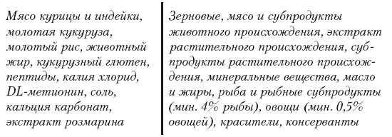 Сравните ингредиенты сухого корма HILL’S Science Plan (слева) и корма «эконом-класса» (справа):Обратите внимание на наличие в корме животного жира. Если на этикетке на первом месте указаны «зерновые», это говорит о большом количестве углеводов, содержащихся в корме. Как уже отмечалось, белок растительного происхождения, содержащийся в кукурузе, имеет низкую биологическую ценность.