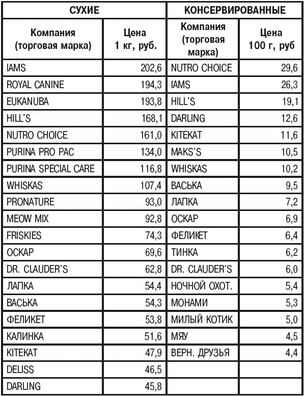 По данным опроса посетителей выставки ЗООСФЕРА-2004 (Санкт-Петербург) самыми популярными торговыми марками оказались Whiskas, KiteKat, Hill’s, Pronature, Royal Canin, Iam’s и Dr. Clauder’s.