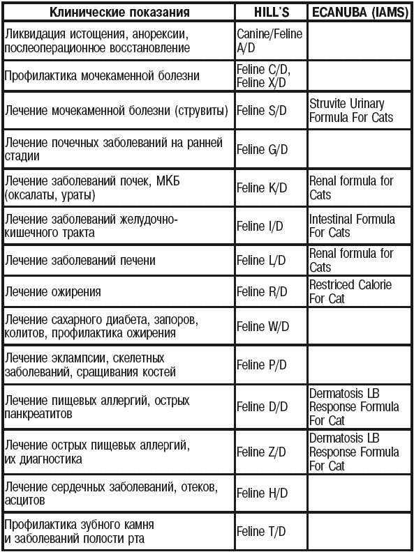 Таблица 8. Диетические корма для кошек от HILL’S и IAMS