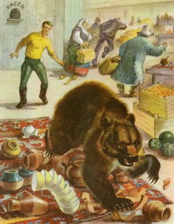 Дымка бодро подбежала к кассе, получила в награду конфетку и билет. Настроение у медведицы в тот день было особенно весёлое. Она с удовольствием прыгала, играла со мной. Публика была в восторге. В заключение Дымка станцевала вальс и начала, как мячик, подпрыгивать. Я никак не мог унять шалунью. Она прыгала и пятилась, прыгала и пятилась… Толпа расступилась. Я не заметил, как мы приблизились к торговому ряду. Последний прыжок был самым высоким. Медведица прыгнула и приземлилась на ковёр с посудой.