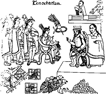 На девятый день месяца Кечолли, в 1-й год Тростника (8 ноября 1519 года) — юбилейный год Кецаль- коатля, teteo вошли в столицу Аиауака. Отряд из немногим более трехсот человек в сопровождении нескольких тысяч союзников и носильщиков проходит под грохот барабана с развернутыми знаменами и, насколько позволяет толпа горожан, с соблюдением парадного строя.