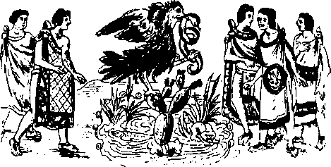 Оказавшись в этой столь желанной долине, вновь прибывшие должны были наткнуться на сопротивление коалиции местных племен, которой руководил Копил, сын Ма- липальхочитль, оставленной в нуги сестры Колибри-Левши. Встреча произошла в Чанультепеке, па берегу лагуны Мехико. Мешики были разгромлены, а их король Хвицилих- витль захвачен в плен и принесен в жертву. Копил, в свою очередь, тоже убит — жрецом Колибри-Левши или самим, в очередной раз перевоплощенным, богом. Жрец идет в то место, где стоит трон Кецалькоатля. С высоты этого трона он швыряет сердце Копила в лагуну. Именно здесь будет основан позже Мехико-Теночтитлап.