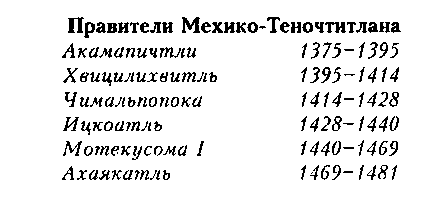 После краха, предположительно в XII веке, империи тольтеков, о которых нам почти ничего не известно, край был захвачен варварами-чичимеками. В хрониках часто описывается грубый образ жизни этих кочевников и вместе с тем очень быстрое их приобщение к культуре. Их король Шолотль сначала обосновался возле Хальтокана, а затем в Тенайуке... Другими «иммигрантами» были: тенапеки, которые поселились в Аскапоцалько; акольхуас, которые заняли восточные берега озера и город Коатличан; свирепые отоми... Образовалось целое множество городов-государств и их объединений, находившихся в постоянной вражде. На востоке — тройственный союз акольхуас из Коатличана, Хвексотла и Тескоко (ранее Тегцкоко). На север от Мехико — Хальгокан и Теиайука. На запад — тенаиекские города Тлаконаи и Аскапоцалько. На юг — Кольхуакаи, Хочимилько с его «плавающими огородами» и Чалько. Первые пятьдесят лет существования Теночтитлана скупо отражены в исторических документах. Около 1352 года мешики участвовали, но-видимому, вместе с акольхуас и жителями Хуэксоцинко — города, расположенного в соседней долине Пуэбла, в нападении на тласкальтеков. В это время они должны были действовать в орбите влияния Аска- ноцалько. Проживавшие в этом городе тенапеки значительно расширили свою власть при великом Тезозомоке, около 1370 года. Именно этот Тезозомок назначил в 1371 году первого правителя Мехико. Об Акаманичтли говорится то как о человеке из рода тенанеков, то как о сыне одного