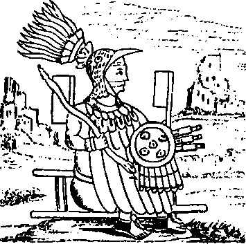 Уицилопочтли, Колибри-Левша, держащий в правой руке устройство для полета, а в левой — стрелы, щит и флажок. Дюран, Historia... 1867-1880
