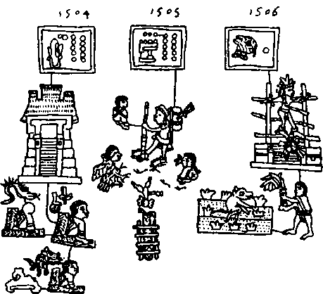 Появлялись зловещие знаки в небе. Мало того, что солнце все иссушило, — теперь оно задумало исчезнуть. 16 марта 1509 года солнечное затмение (согласно Anales Куаутит- лана — в 13-й день Смерти) посеяло панику среди простых людей, которые принялись вопить от страха, ударяя себя рукой по губам. Смятение и крики были повсюду. Люди опасались, что в случае полного исчезновения солнца оно может опуститься раз и навсегда, а затаившиеся в небесном своде ночные чудовища, цицимимы, спустятся на землю. Цицими- мы стали бы тогда пожирать людей, а еще не родившиеся