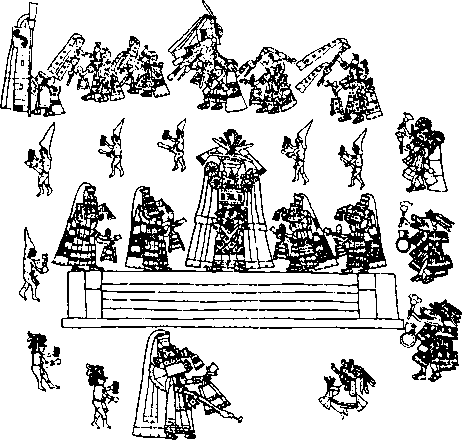 Следующий двадцатидневный «месяц» назывался Паи- квецалицтли, «Подъем флагов». Ритуалы оставались прежними: мифические странствия, но в этот раз — странствия мешиков. Они воспроизводились в длинной процессии вокруг одной из лагун; важным было, однако, центральное событие странствий — рождение Уицилоночтли и его победа над Коатеиеком. Выкупанные в связи с ритуалом рабы, наряженные как Уицилоночтли, сражались против воинов хвициауас. Император сам вооружал их сосновыми палками и щитами, украшенными глазами «волка» (cuetlachtli). Затем происходило жертвоприношение военнопленных.