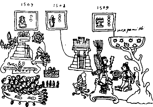 Под 2 м годом Тростника (1507) представлена гора Хвиксачтекатль с храмом на вершине; внизу — приспособления для добывания огня. В источнике упоминается также частное затмение солнца и землетрясение (на рисунке — четырехугольное поле с глифом «движение»). Ниже — 2000 воинов, уносимых рекой Тозак. Под 4-м годом Дома (1509) — пирамида света, предвестница конца империи. Слева — сражение с Зозолланом