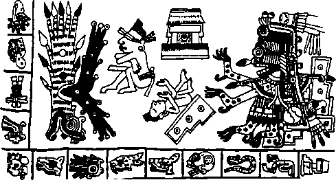 Звезда — огонь в небе. Огонь можно представить себе как начальную искру жизни, стало быть — как семя. В начале всякой жизни присутствует некая искра, высеченная Ометеот- лем в горных высотах, — маленькое пламя, проникающее в женщину в момент зачатия. Миф о первоначальной трансгрессии (нарушении запрета) восходит к очень древним временам. Существуют многочисленные варианты этого мифа, некоторые из них являются весьма древними и явно более примитивными. Так, повествуется, что Кецалькоатль и Тец- катлипока разрубили надвое гигантского каймана но имени Тлальтеотль. Этот кайман, который обитал в первичных водах, был богиней земли. Из одной половины разрубленного каймана братья создали землю, из другой — небо. Возмущенные таким неадекватным поведением другие боги — с целью утешить Тлальтеотль — поручили ей с тех пор производить в достаточном количестве всевозможные необходимые для пропитания людей плоды; взамен богиня потребовала в качестве нищи для себя человеческую кровь и человеческие сердца. Как в мифе о рае (нарушение запрета), здесь преступное нападение на Тлальтеотль вызывает появление Земли и полезных растений и обусловливает неотвратимость смерти. К этому добавляется существенный для месоамерикаис- кого менталитета пример: в смерти зиждется жизнь.