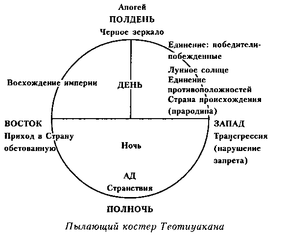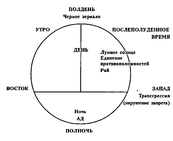 Рассмотрим, например, миф о грехопадении Тамоапча- па. Изгнание из рая - это конец целой эпохи, отождествляемый с угасанием, закатом Солнца; тем более что наказываемые персонажи оказываются во мраке ночи. Если конец райской эры — это закат Солнца, то эта эра, в сущности говоря, соответствует послеполуденному времени. В месоамериканской модели дня время после полудня — это период единения противоположностей. Это в точности райский век: период полной гармонии во вселенной — между создателями и их созданиями, а также между самими созданиями. В начале же, в кульминационной точке, то есть в самый полдень, действует верховная божественная пара, созидающая рай. Райской эре, моменту падения и схождению с небес на землю соответствуют, таким образом, время после полудня, закат Солнца и наступление ночи. Грехопадение выражается в соитии одного из богов с одной из богинь земли: Хочикецаль или Чихуакоатль. А что представляет собой закат Солнца? Начало его вступления в царство смерти, это гак; но, кроме того, это еще и оплодотворение: Солнце входит в Землю и оплодотворяет