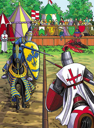 Коли хмара куряви, що її здійняли копита розпашілих коней, осіла, стало видно, що добрячу половину лицарів вибито з сідел. Вершники, які залишилися в лавах, знову зімкнулися, вихопивши мечі. Брязкіт зброї, крики й звуки сурм заглушали стогони поранених, блискучі обладунки лицарів укрилися пилом і кров’ю, а пишне пір’я плюмажів, зрублених із шоломів гострими лезами, літало в повітрі.
