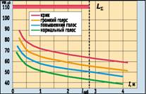 Рис. 5. Допустимые УПР в зависимости от расстояния l между пассажирами при различной силе голоса (1каб — длина кабины вертолета)