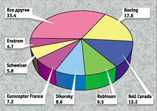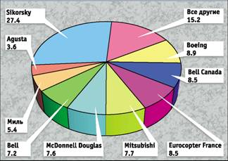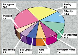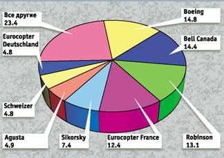 В вертолетной индустрии продолжаются перемены. Boeing согласилась продать линии производства вертолетов MD-500, MD-600N, MD Explorer, прежде производящихся фирмой McDonnell Douglas, компании MD Helicopter Holding Inc, дочернему предприятию базирующейся в Европе компании RDM Holding Inc. Правда, сделка еще должна быть одобрена Федеральной торговой палатой США, поэтому на секторной диаграмме доля фирмы Boeing на рынке представлена с учетом прогноза производства этих летательных аппаратов.