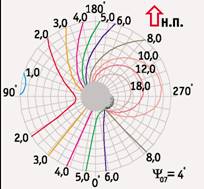 Область больших углов атаки a rHB автожира в азимутах отступающей лопасти находится ближе к центру диска, в корневых, не несущих сечениях. При увеличении скорости полета эта область расширяется, а значения а гдостигают срывных значений. Графики изолиний местных углов атаки (рис.2, V = 210 км/ч) позволяют определить границы областей, занятых срывным обтеканием, для различных значений общего шага лопастей НВ.