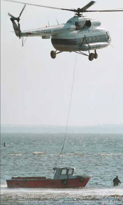 Вертолет «Балтийских авиалиний» переносит на «большую воду» севший на мель рыболовецкий катер. Машину пилотирует экипаж под управлением Валериана Феофанова