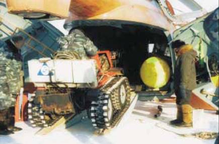 Выгрузка трактора из вертолета в районе Северного полюса. Апрель 1999 г.