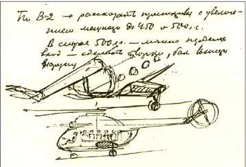 Свой теоретический вывод Миль старается реализовать на практике при разработке проектов модернизации В-2 сразу после постройки первых опытных образцов машины. Расчеты показали, что для достижения более высоких летно-технических характеристик нужны более мощные двигатели. На рис. 4 представлены сделанные Милем эскизы В-2 с новыми двигателями. Над ними запись: «Рассказать перспективы увеличения мощности до 450-500 л.с. В этом (ред.) случае …можно изменить вход – сделать створки, бак вынести наружу» (дневник, 1965 год).
