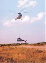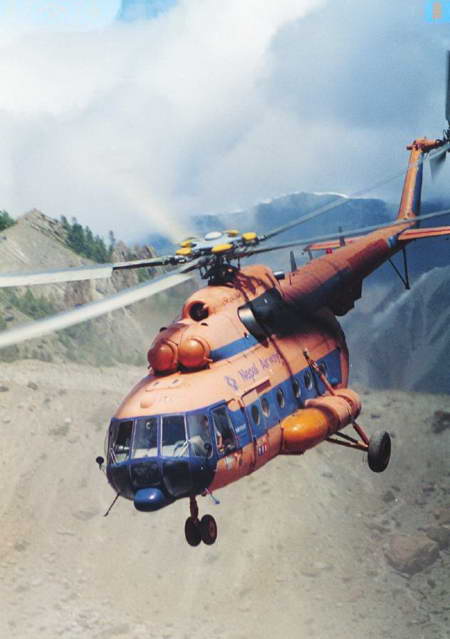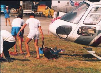 В 1996 году мне посчастливилось побывать и полетать в Непале. Знакомство началось со столицы государства Катманду, расположенной на высоте 1300 метров над уровнем моря. Первое впечатление – шок от немыслимых контрастов. Узкие улочки старого города и суперсовременные здания, жуткая вонь от нечистот на улицах и пряные экзотические запахи восточных приправ. Еще один «шок», но более приятный – от количества праздников. Кажется, что их больше, чем дней в году. Есть День Коровы, Собаки, Змеи, Воды, Огня, Крови… Некоторые праздники сопровождаются жертвоприношениями, и тогда на городской площади закалывают козленка или буйвола. Не избежали освящения кровью и наши вертолеты, а точнее, все летательные аппараты, работающие в то время в Непале. На снимке можно видеть обряд, предшествующий первому полету вертолетов вновь созданной непальской авиакомпании. Этот обряд так же важен, как оформление документации перед вылетом летательного аппарата.