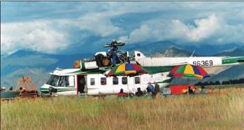 В Тибет вместе с вертолетом, перевозимым, естественно, в разобранном виде, мы прибыли на самолете Ил-76. На одном из аэродромов недалеко от столицы сами собрали вертолет, и вскоре Ми-17-1В поднялся в воздух – в свой первый самостоятельный полет в Тибете. Зрелище, прямо скажем, незабываемое: изящная машина на фоне ослепительно белых горных вершин, голубого неба и… взлетающих по соседству «Боингов».